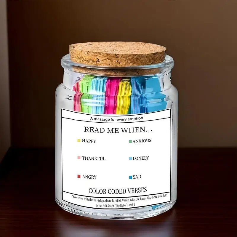 جرة جميلة مليئة ببطاقات آيات قرآنية ملفوفة، تحمل كل منها تذكيرًا بآيات الله. مثالية للتأمل اليومي، أو للاستخدام العائلي، أو كهدية، فهي تُغذي القلوب بالهداية والذكرى.