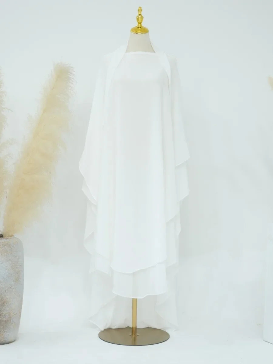 A flowing extra-long khimar designed for full modest coverage and graceful style. With two layers for added opacity and drape, it provides comfort and elegance for prayer, daily wear, or gatherings. The front length measures 120cm, while the back extends to 159cm, ensuring complete coverage with a refined look.
