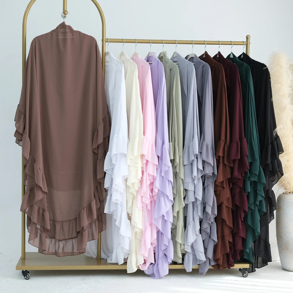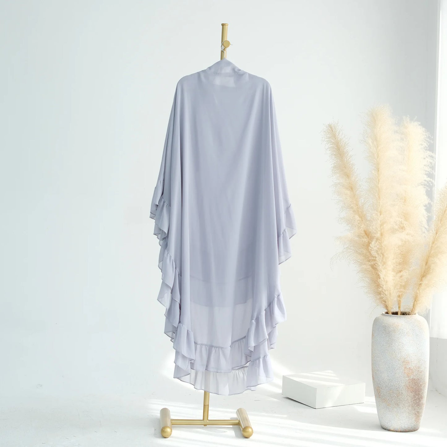 A flowing khimār crafted from lightweight chiffon with elegant double ruffle layers. Measuring 144cm in length, it provides graceful full coverage while remaining breathable and easy to wear for prayer or daily use.