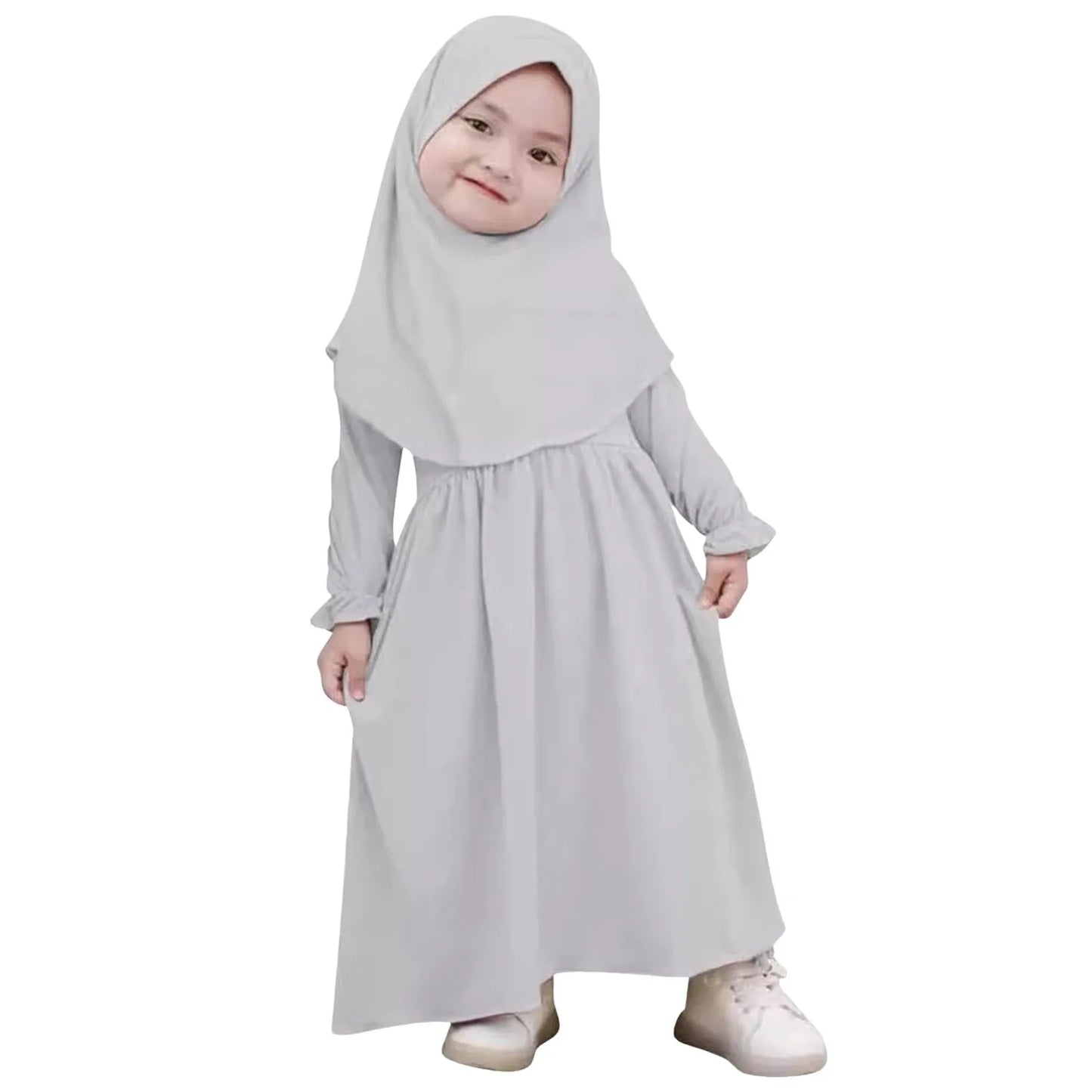 A sweet and modest two-piece outfit designed for little girls, combining a soft flowing dress with a matching hijab. Crafted from lightweight, breathable fabric, it ensures comfort for delicate skin while nurturing modesty from a young age. Perfect for prayer, Eid, and family gatherings.