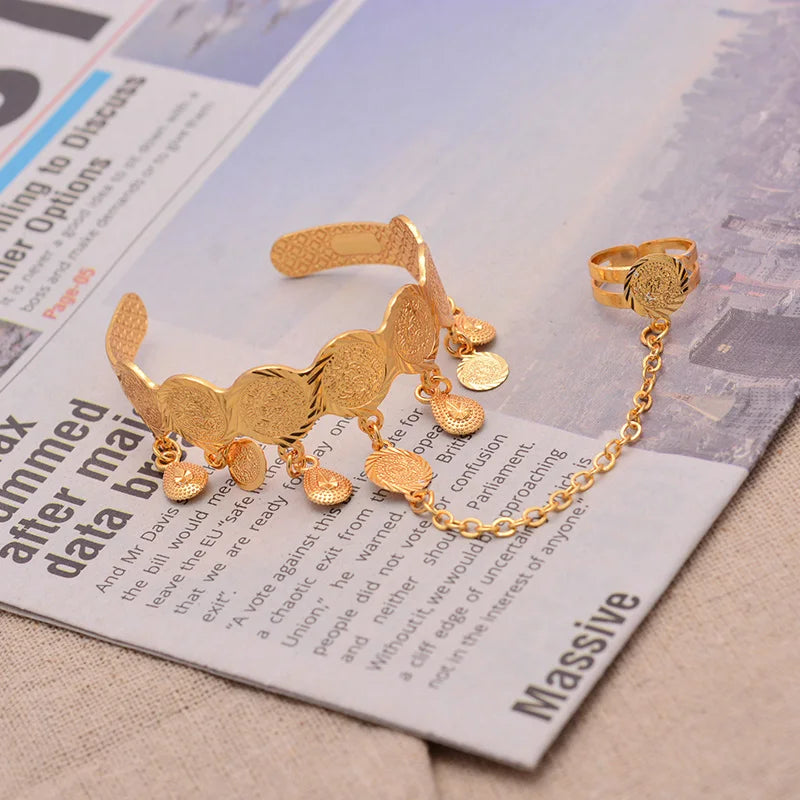 A delicate bangle designed for baby girls, featuring small gold coin accents with an attached ring for a charming finish. Crafted with care, it is lightweight and comfortable, making it a sweet gift for special occasions while reflecting cultural tradition.