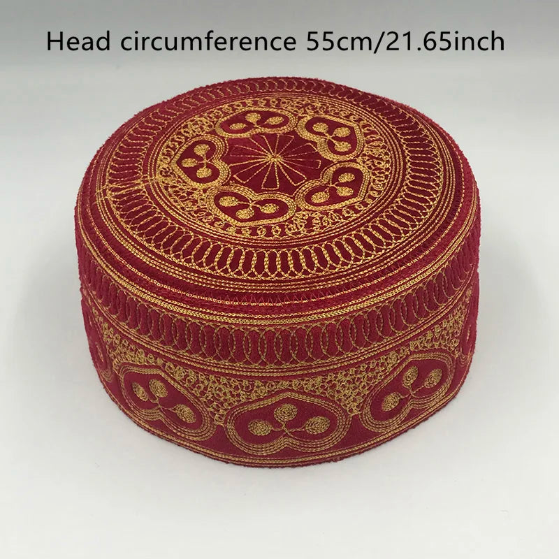 A beautifully embroidered taqiyah crafted in rich red with intricate gold detailing, reflecting tradition and dignity. Lightweight and comfortable, it is ideal for prayer, masjid visits, and special occasions, combining devotion with elegance.