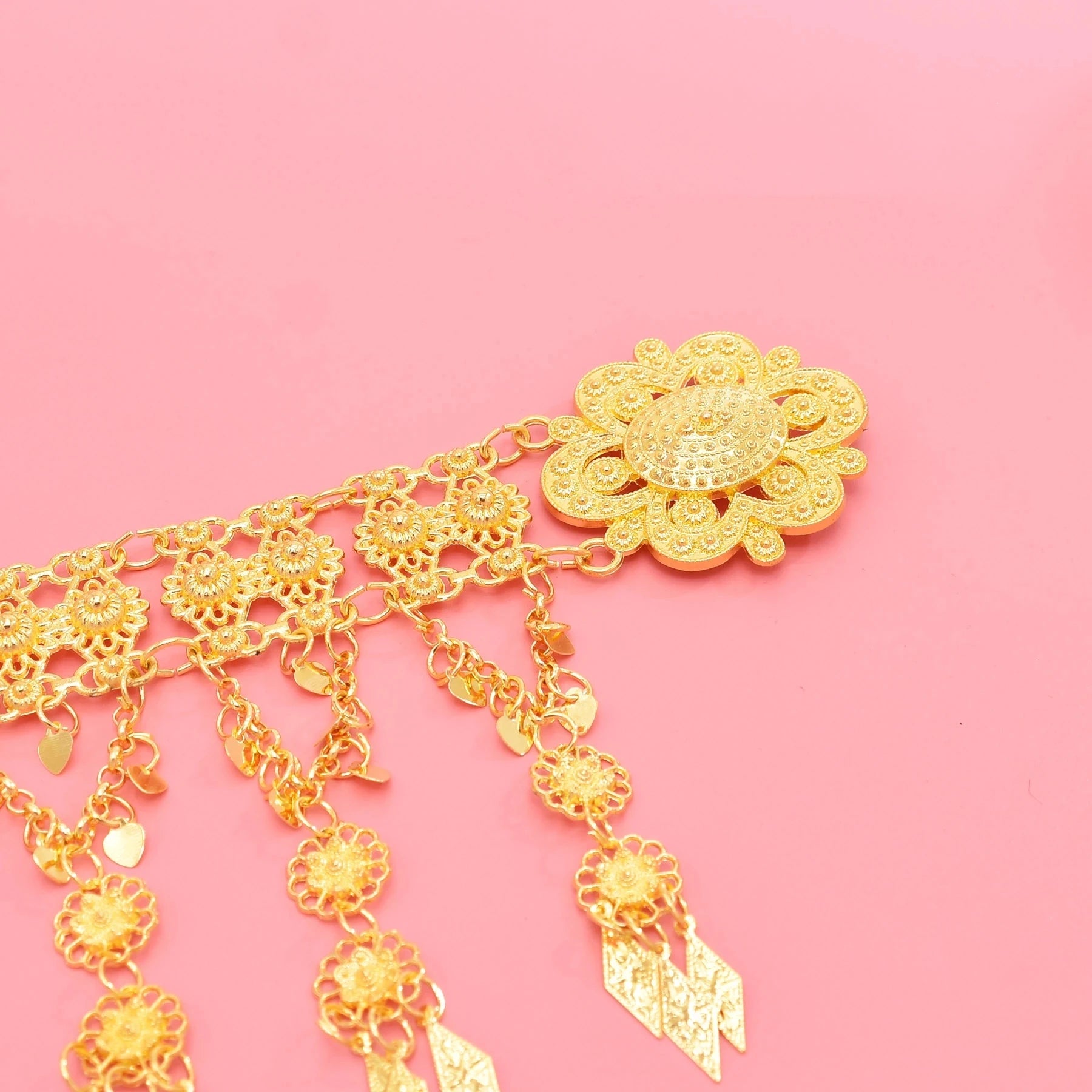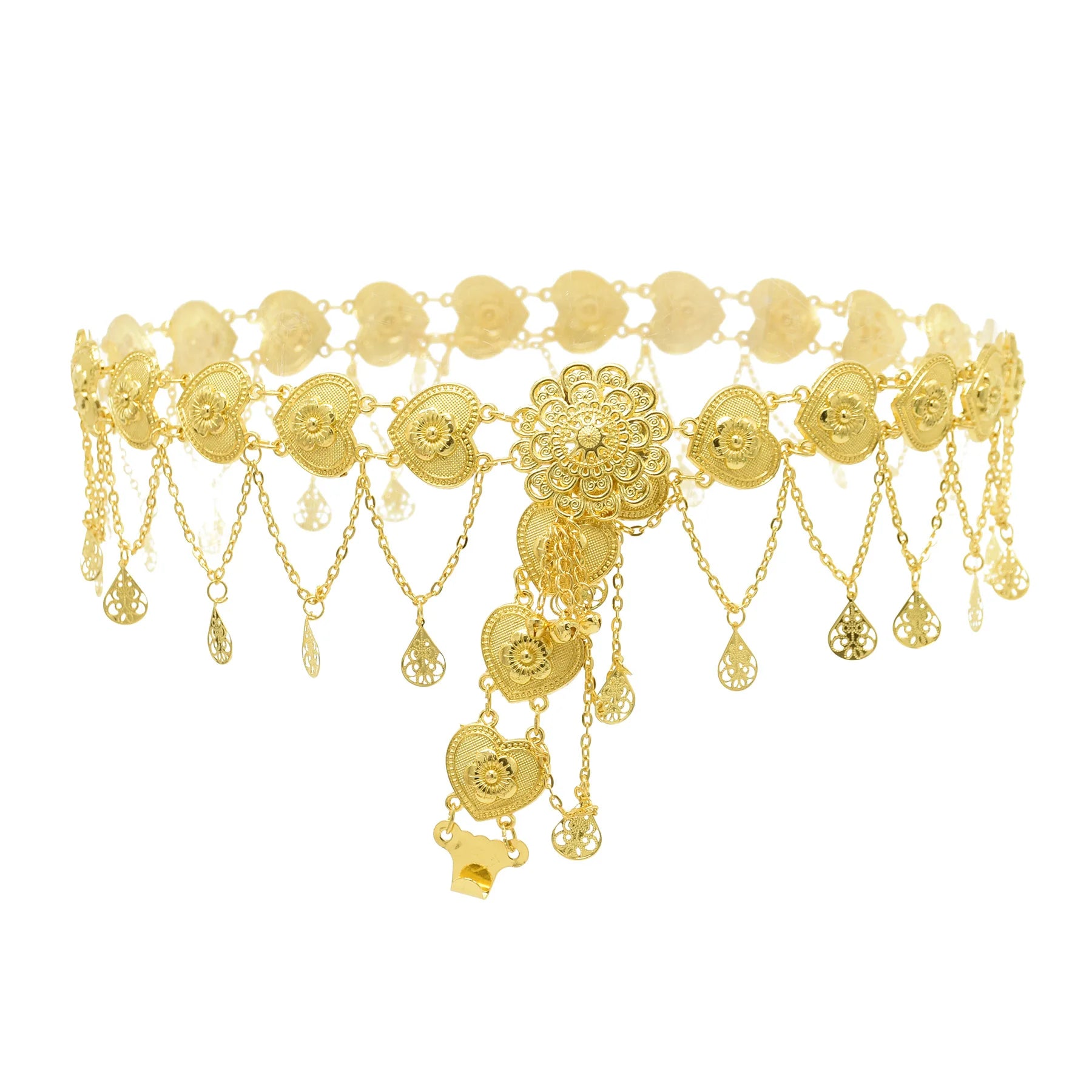 A delicate waist chain with dangling gold coins, crafted for elegance in movement. Adjustable and lightweight, it is best reserved for private wear or women-only occasions.