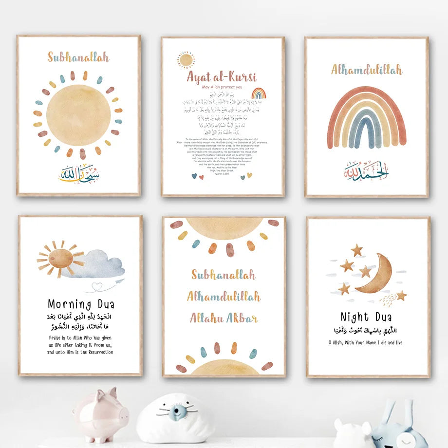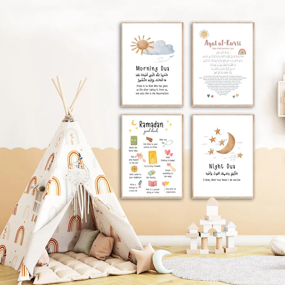 Faith-inspired wall art designed to brighten children’s rooms with reminders of duʿās, sunnah habits, and adab. Featuring soothing colours and playful designs, it nurtures love for Islam while creating a calming and purposeful environment. (Frame not included.)