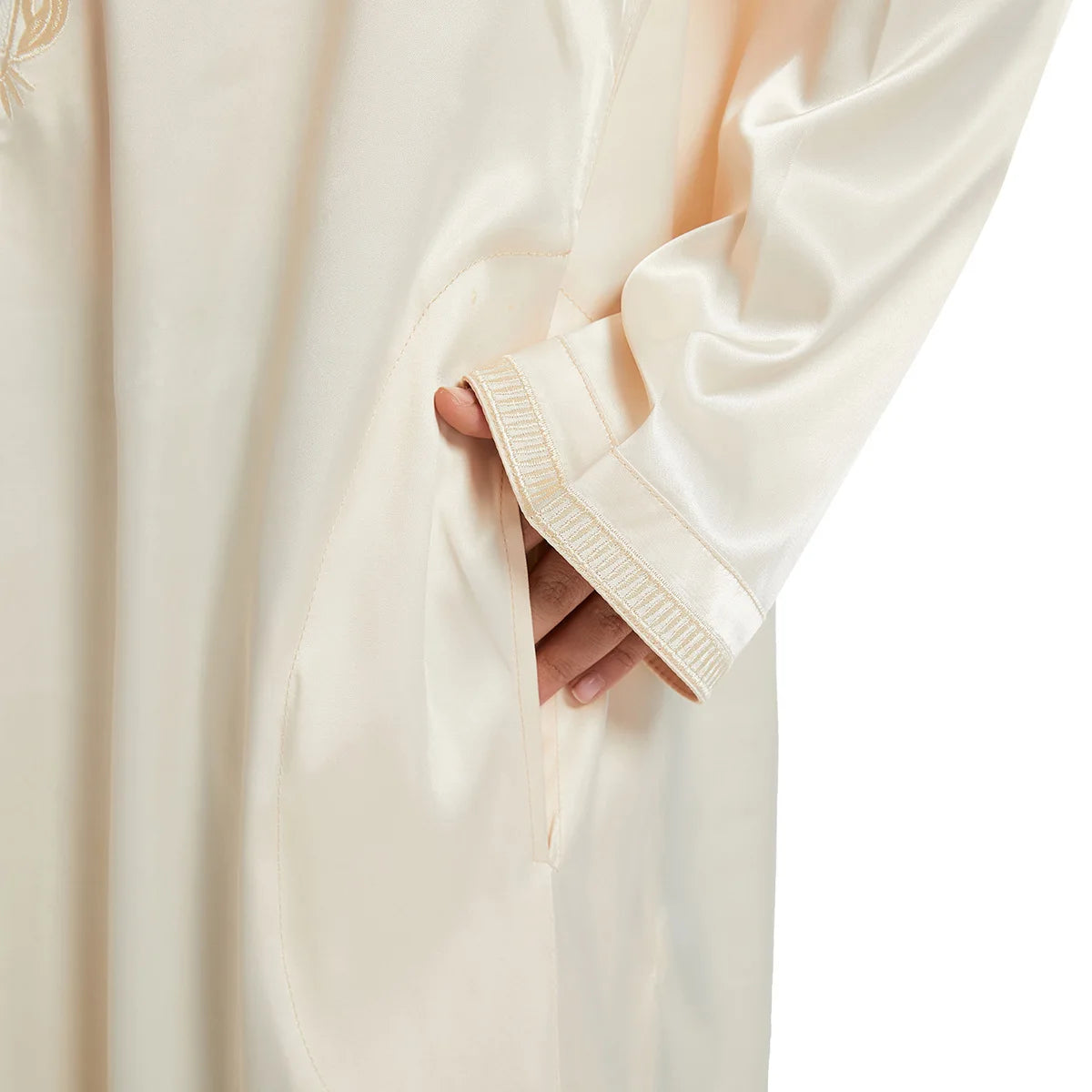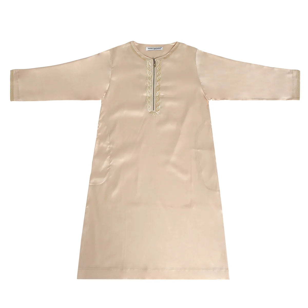 A smart and elegant thobe for boys, crafted from shiny fabric for a refined look. Comfortable and modest, it’s perfect for Eid, weddings, masjid visits, or family gatherings.