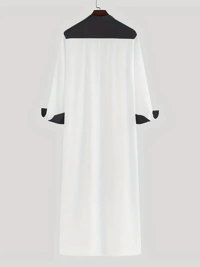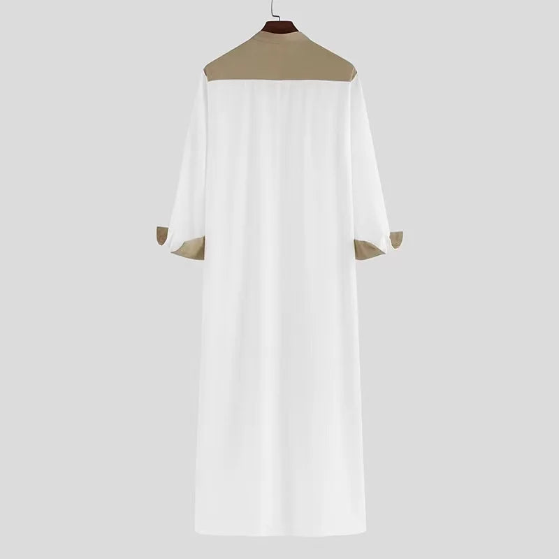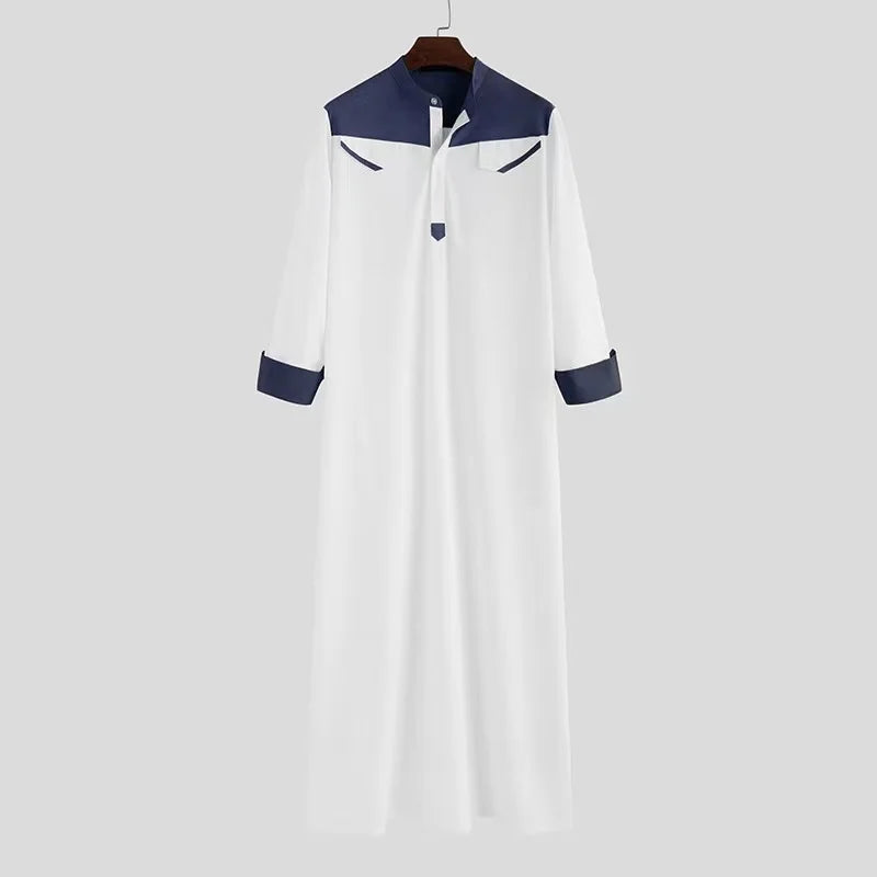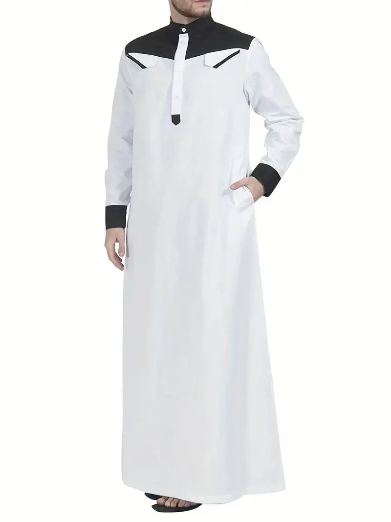 A refined thobe designed with a modern two-tone contrast, blending tradition with contemporary style. Crafted from soft, breathable fabric, it offers comfort for daily wear while keeping modesty at the centre. Perfect for prayer, work, or gatherings.